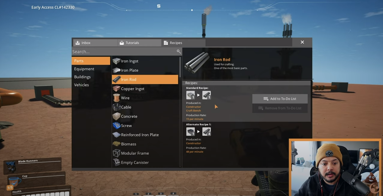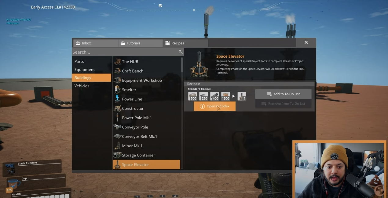 - 건설 메뉴에서 Open in Codex를 사용하여 필요한 재료와 레시피 확인
