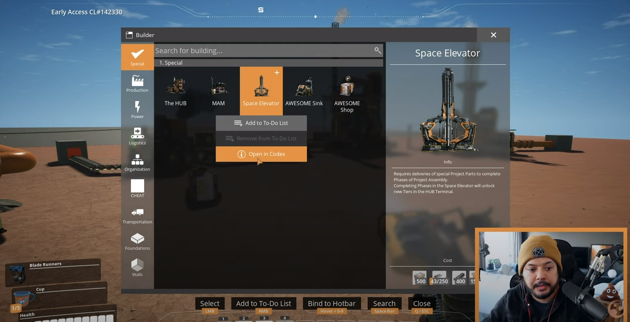 1. 건설 메뉴에서 건설 전에 필요한 재료와 각 재료의 레시피를 확인할 수 있도록 "Open in Codex" 서브메뉴 추가