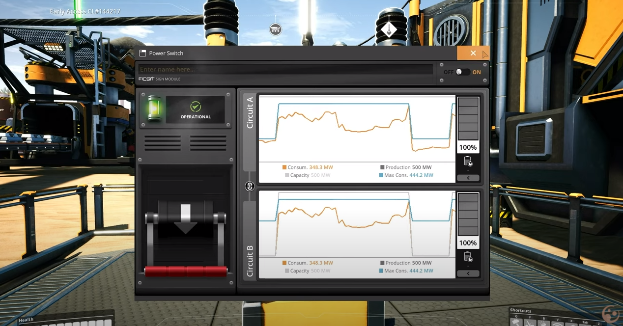 이름은 Power Switch입니다. 대형 배터리 또는 메인 전기와 연결하여, 각 공장의 섹션을 만들 수 있습니다,