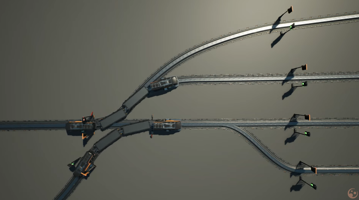 쉽게 설명하자면 위와 같이 게임 내에서 하나의 선로에 신호등이 설치되어 있으며, 앞에 열차가 모든 하역을 끝내고 앞에 있는 신호등을 통과할 때까지 뒤에 기차는 대기를 하게 됩니다.