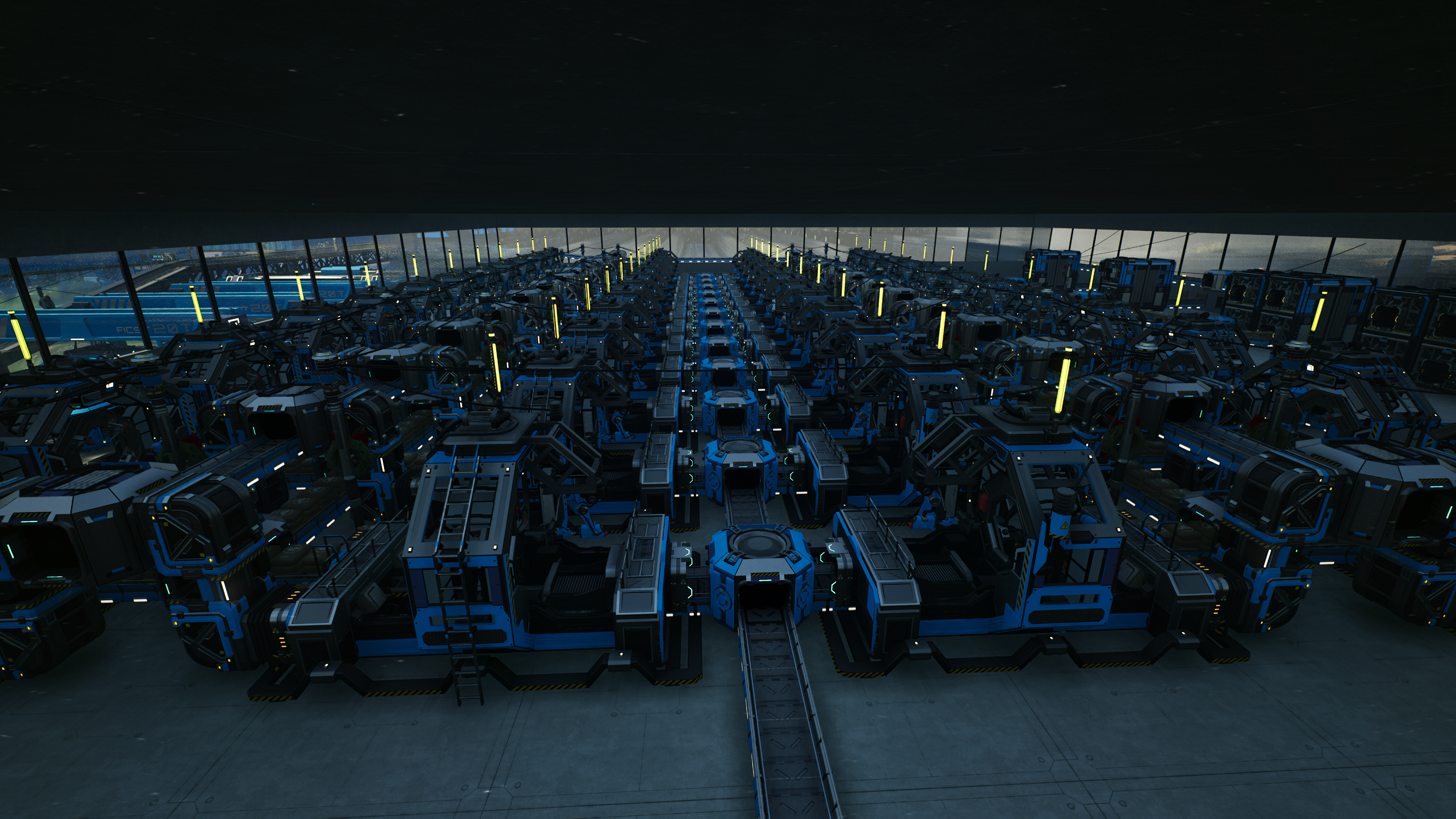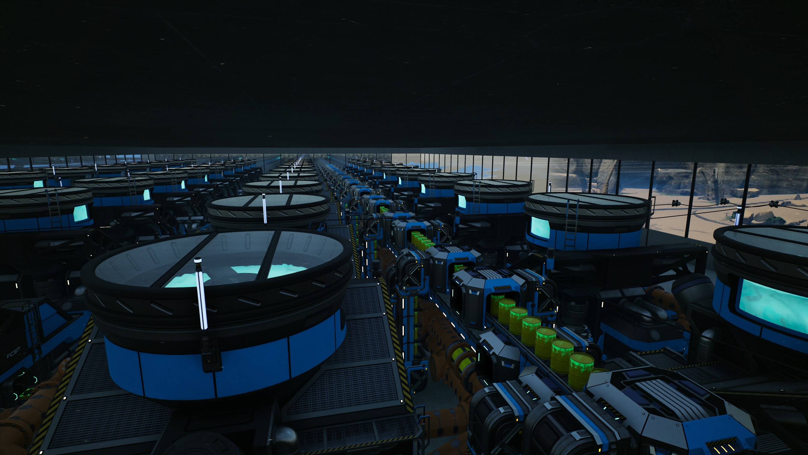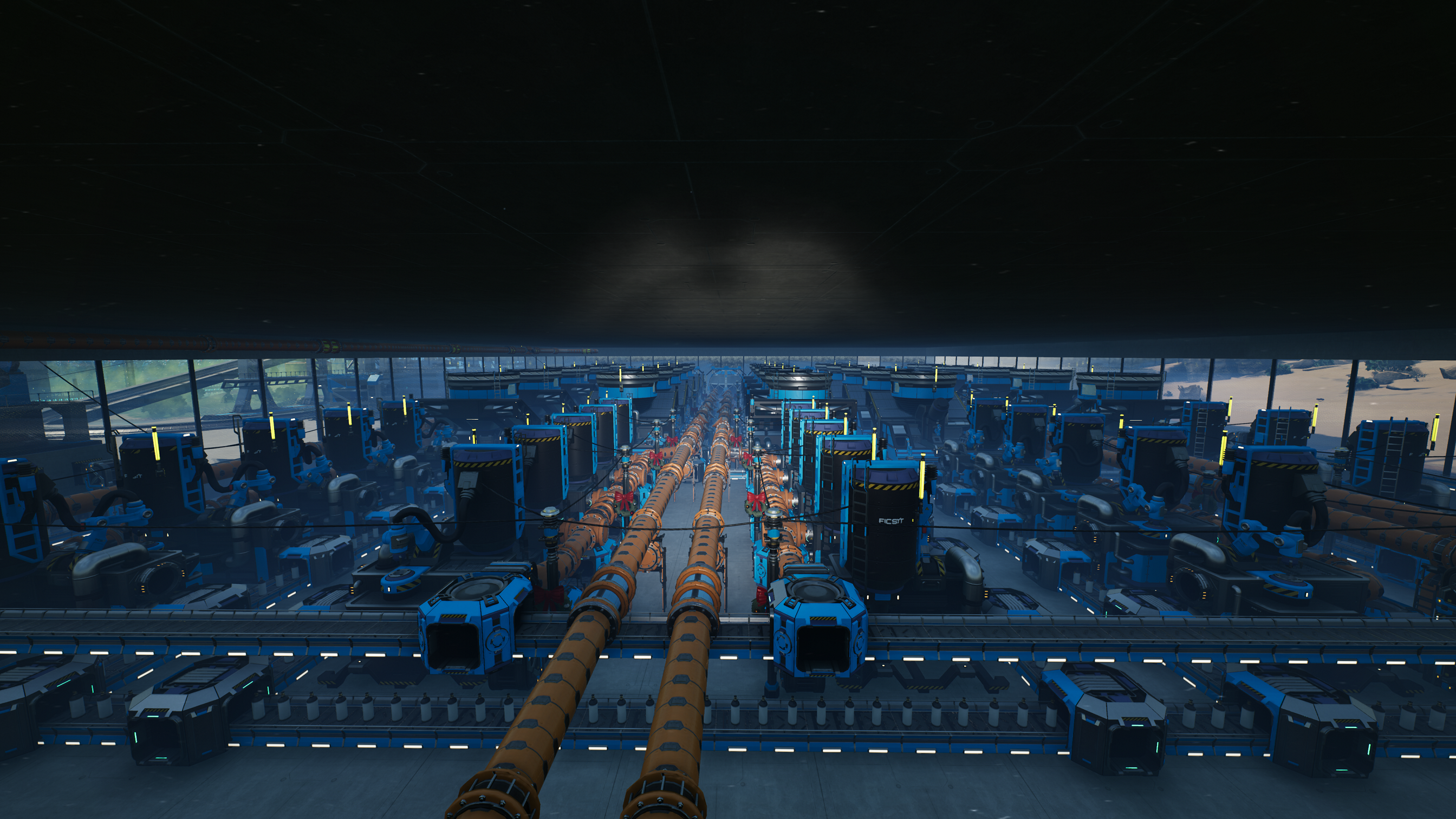 1층은 2층에서 생상하는 비핵분열성 우라늄(Non-fissile Uranium)에 개당 10개의 이산화규소가 들어가기 때문에 많은 양의 이산화규소를 생산하기 위해 거대한 생산라인을 만들었습니다. 총 4기의 드론이 무한반복으로 석영을 배달해오고 있으며, 원자재 부족을 방지하기 위해 라인 초입 곳곳에 저장소가 설치되어 있습니다.