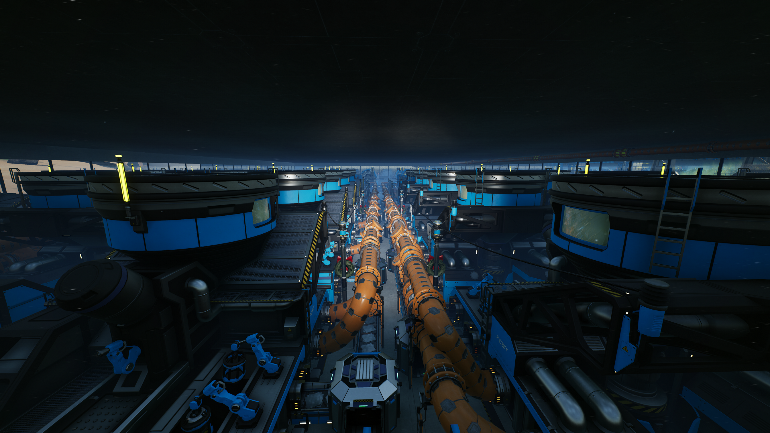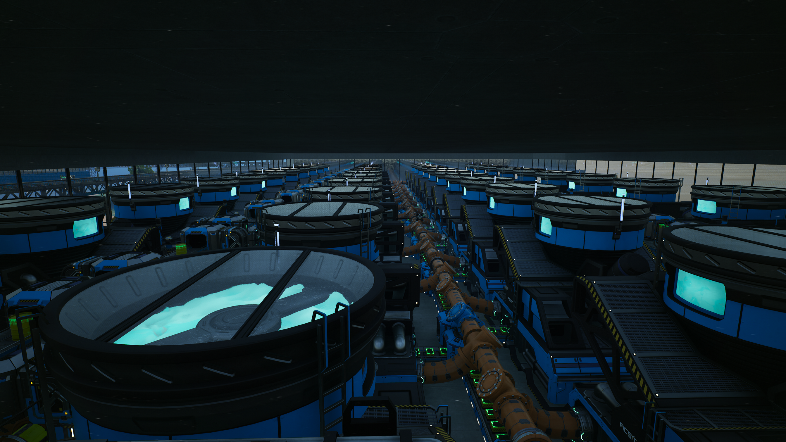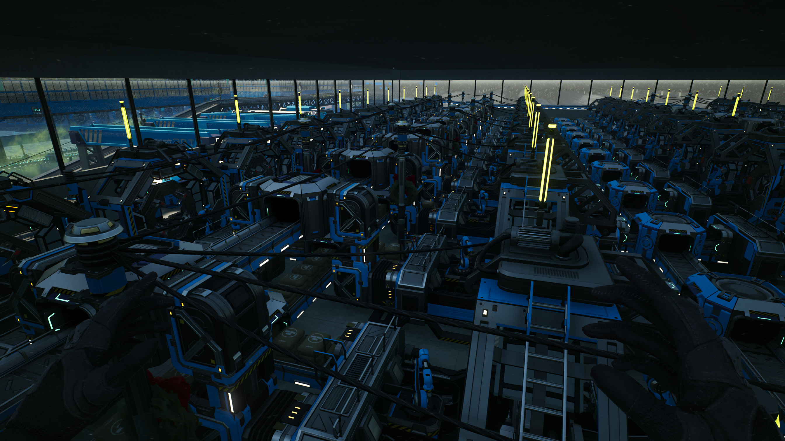 1층은 2층에서 생상하는 비핵분열성 우라늄(Non-fissile Uranium)에 개당 10개의 이산화규소가 들어가기 때문에 많은 양의 이산화규소를 생산하기 위해 거대한 생산라인을 만들었습니다. 총 4기의 드론이 무한반복으로 석영을 배달해오고 있으며, 원자재 부족을 방지하기 위해 라인 초입 곳곳에 저장소가 설치되어 있습니다.