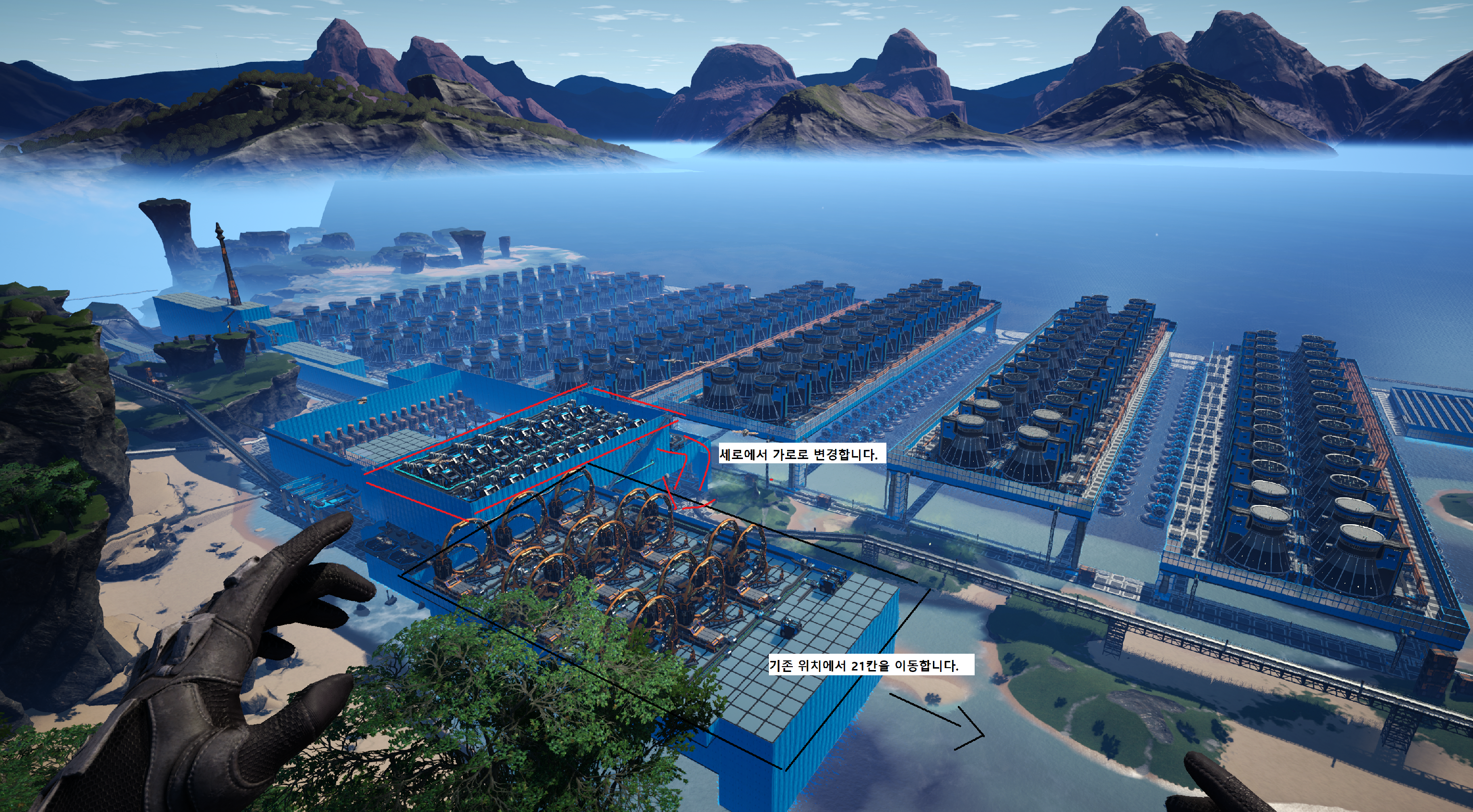 1. 검은색 박스: 플루토늄 펠릿 생산공장. 이 공장이 기존 위치에서 오른쪽으로 21칸을 이동하여 여유 공간을 만듭니다.