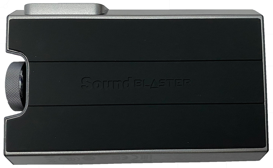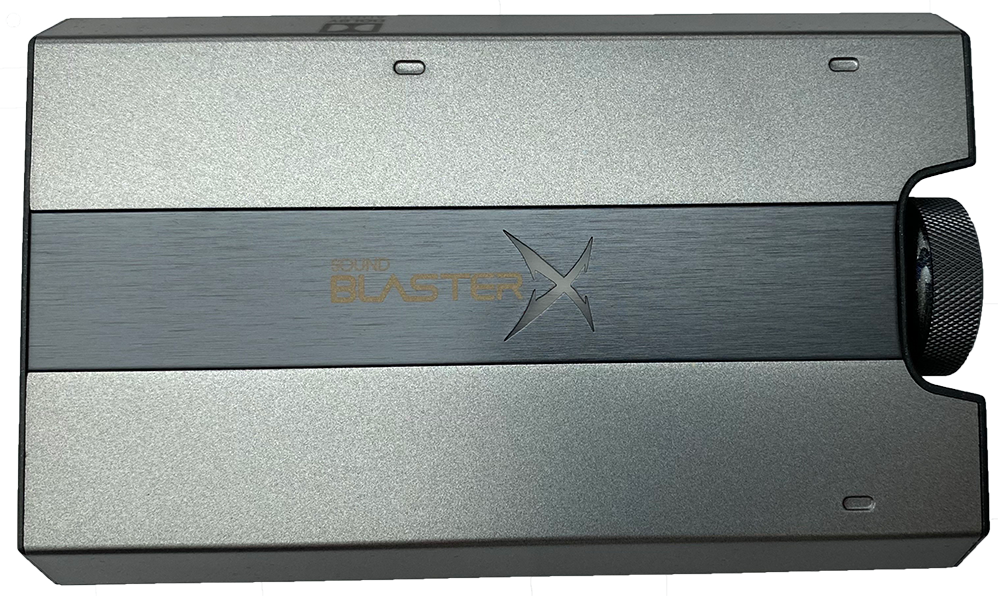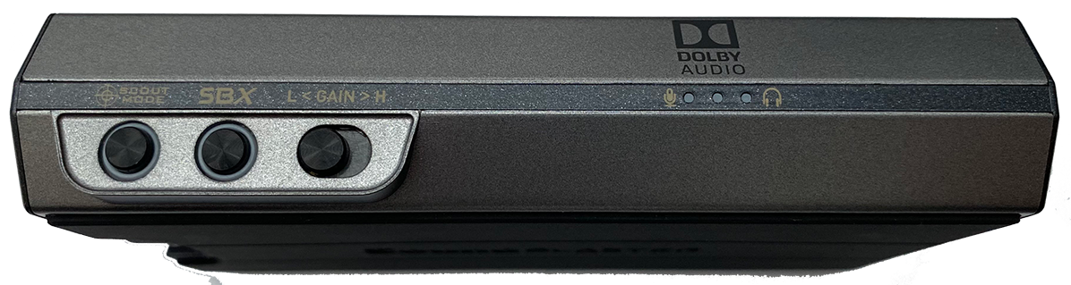 상단은 은색과 회색으로 되어 있으며, 가운데 Sound BlasterX 글자가 적혀있으며 X는 LED로 되어 있습니다.