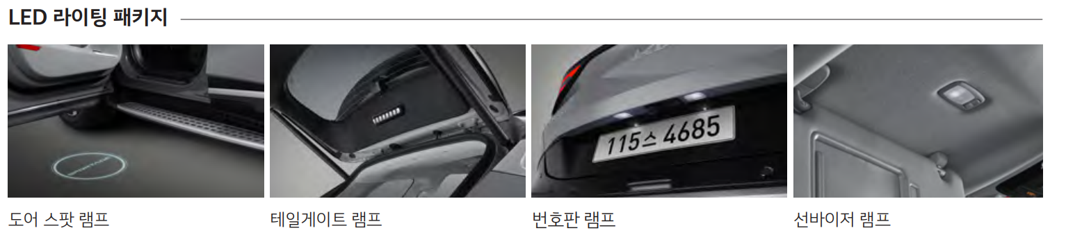 LED 라이팅 패키지는 도어스팟 램프, 테일게이트 램프가 출고 시 장착되어 나오고
