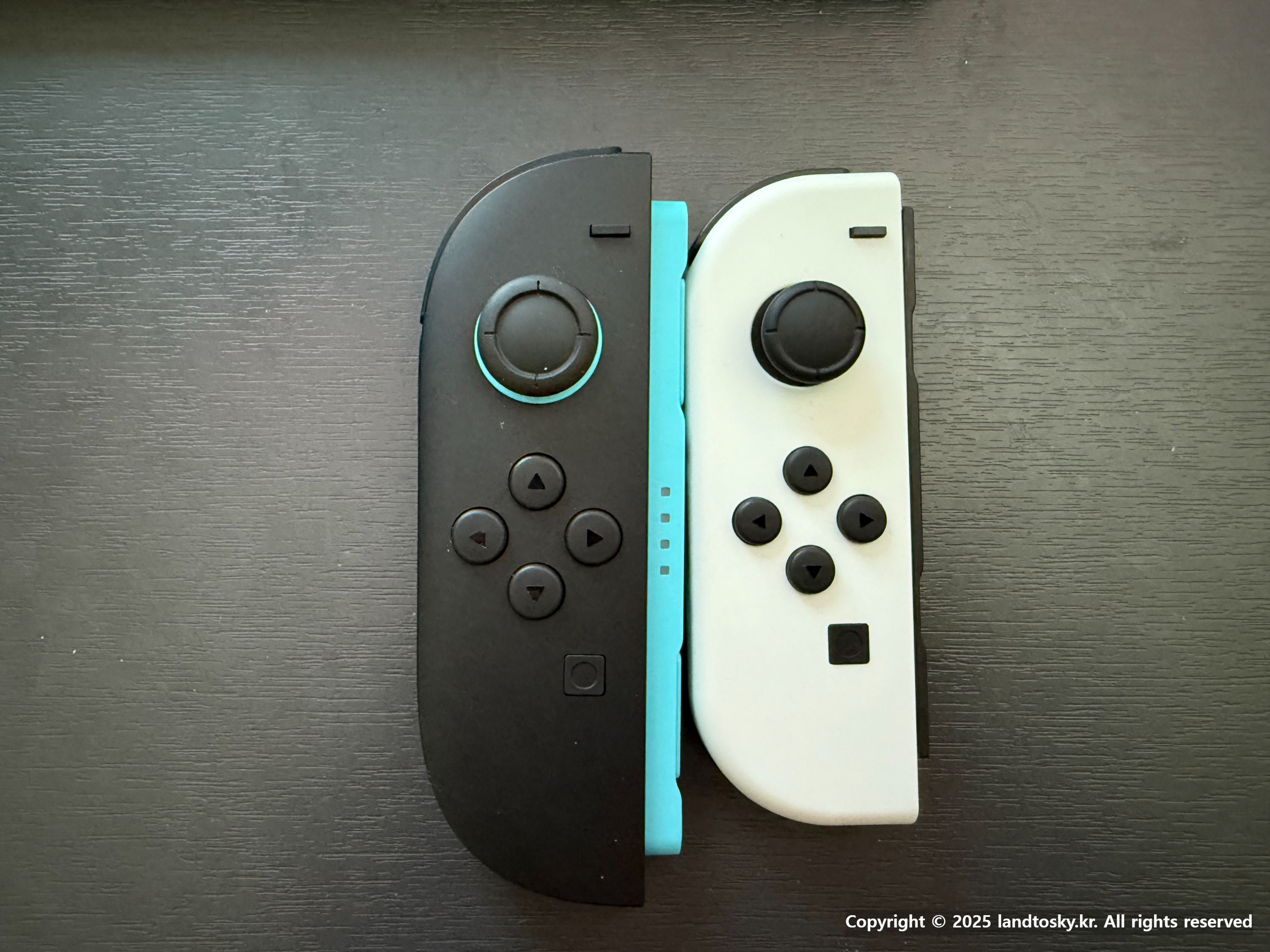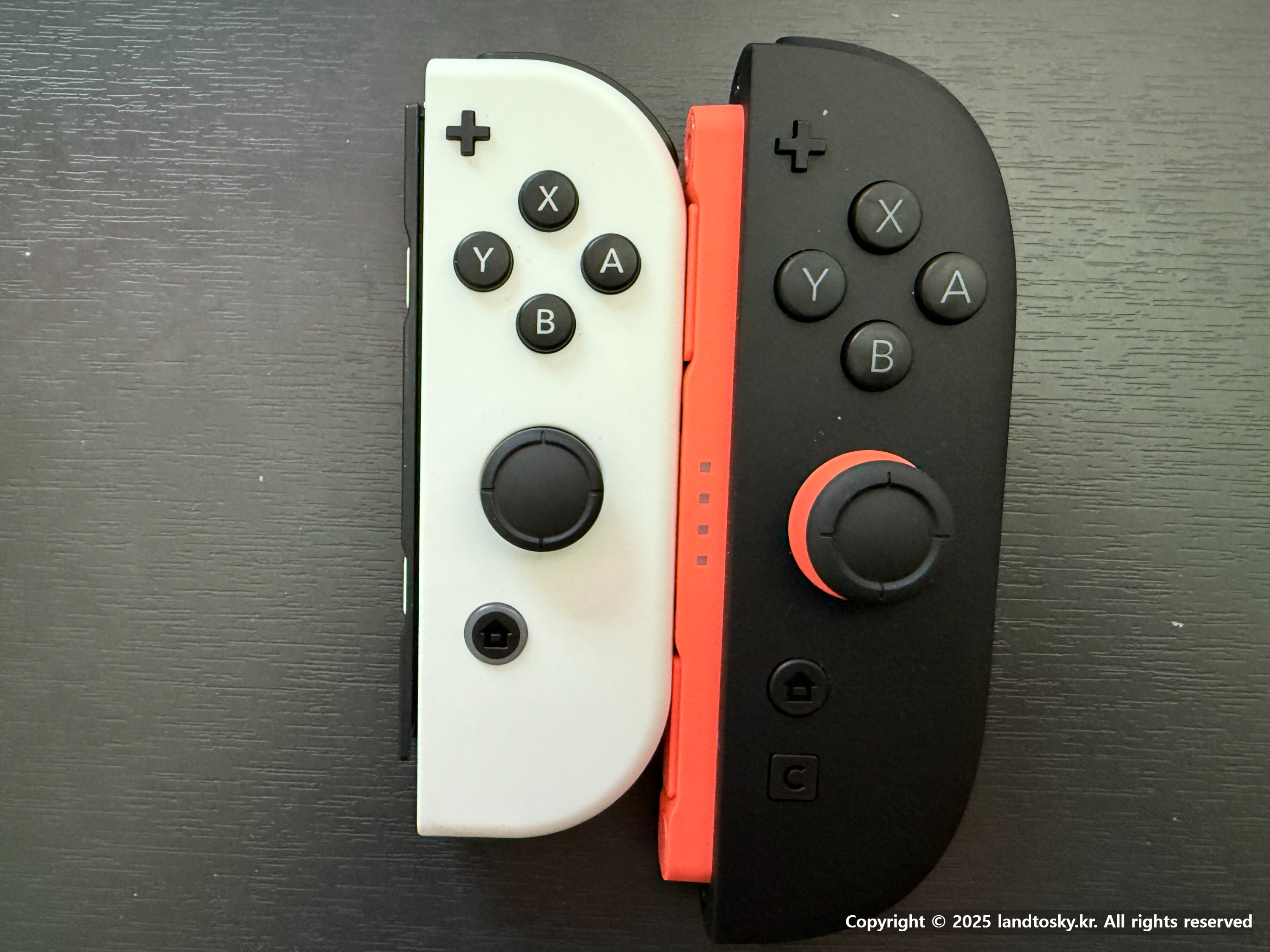 조이스틱과 버튼 위치는 비슷했으나, 스위치 2의 조이콘이 가로로 조금 더 길어졌습니다.
